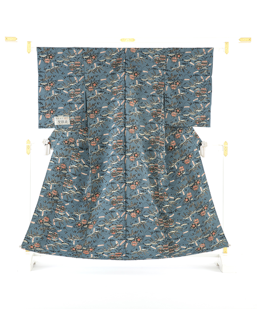 下平清人さんは、1936年に長野県飯田市で生まれ、1956年に重要無形文化財保持者(人間国宝)として認定された芹沢銈介氏に師事しました。芹沢氏が確立した「型絵染」は、型彫り、型つけ、染めといった工程が一人で行われる独特の手法です。20年以上にわたり芹沢氏のもとで修行したことから、彼の一番弟子と称されることもありますが、型絵染に関わり60年以上が経過し、現在も那須塩原にある工房で個性的な着物や帯を制作しています。