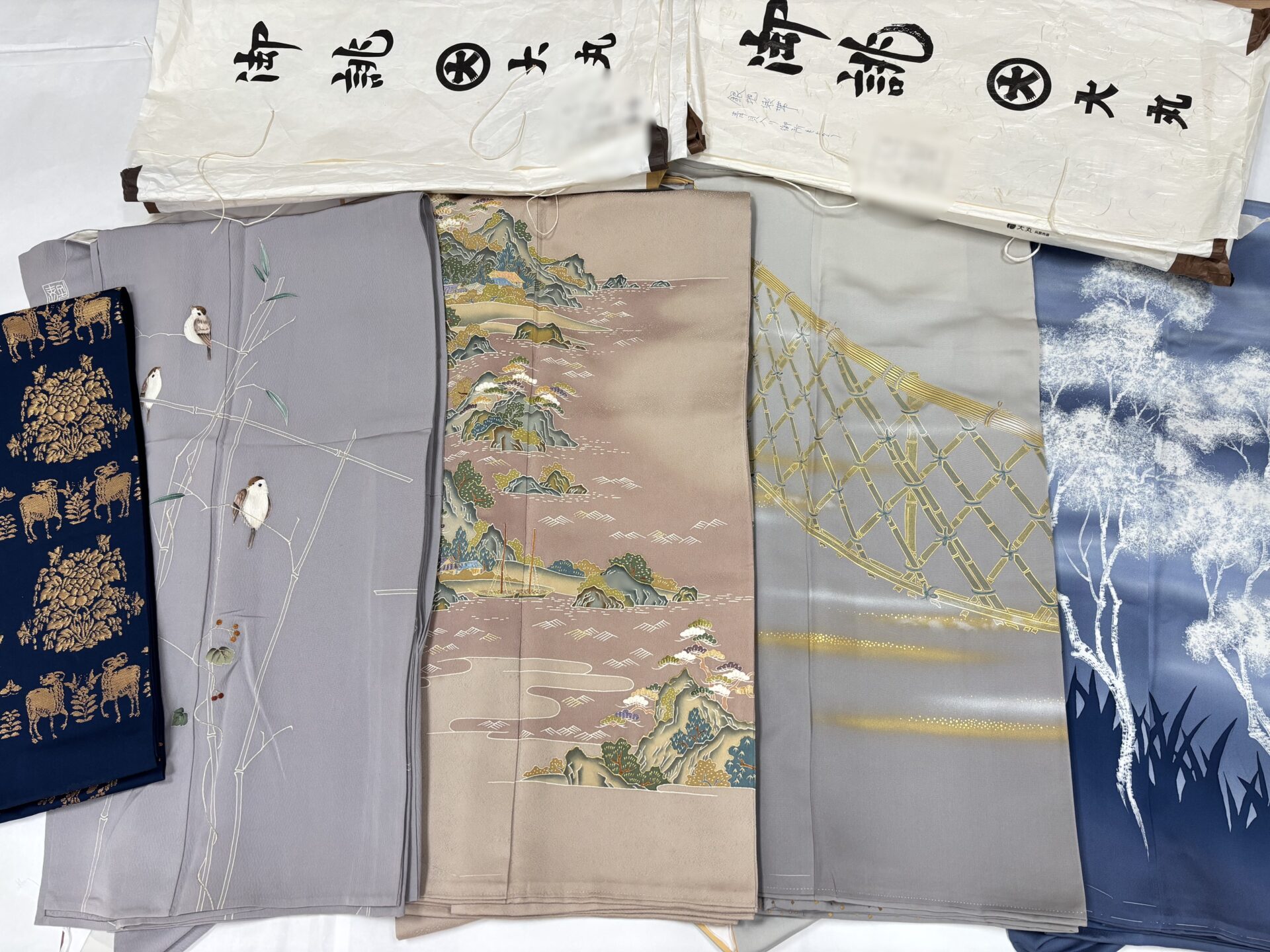繊細な刺繍技術が魅力的で奥行きのある大羊居や大彦のお着物、福田喜重さんの大人らしい落ち着いた美しいお着物、龍村平蔵さんの重厚感があり格調高い袋帯など、複数点お譲りいただきました。