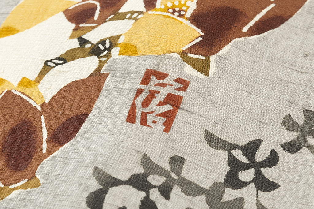 塩入守治さんは長野県上田市出身で、芹沢銈介氏に師事し、国画会の会員である型絵染作家でした。塩入守治さんの作品では、型紙にはカキの渋で張り合わせた和紙が使用され、全面に絹の紗(網)が漆で張り付けられ、こぬかともち粉で練った糊で型付けされ、それを染めるという手法が採用されています。かつては型付け専門の職人も存在しましたが、塩入守治さんは図案を型紙に描き、一刀一刀を丹念に彫り上げ、全てを一人で制作しました。彼は1994年に他界しました。
