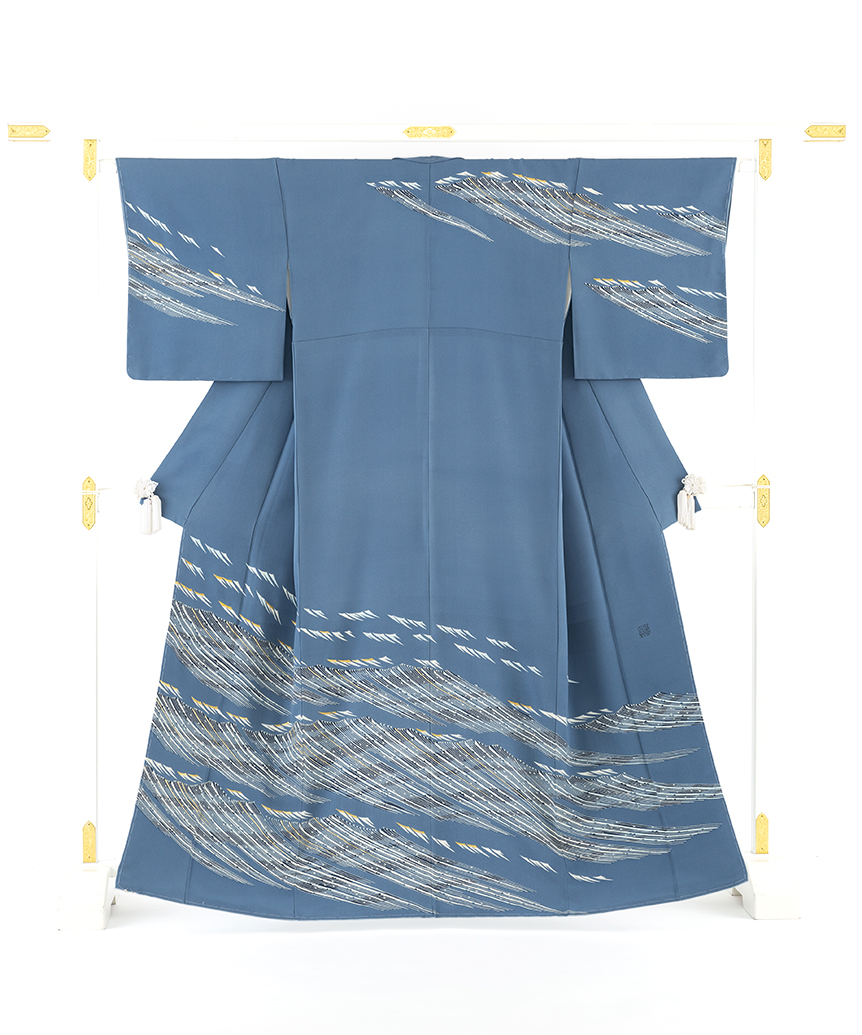 山田貢さんは、重要無形文化財保持者(人間国宝)であり、日本工芸会正会員としても活躍していました。山田貢さんは伝統的な友禅技法を駆使し、大胆な構図と清冽な色彩による新しい友禅の世界を切り拓き、染織界に大きな影響を与えた一人です。 山田貢さんの作品は、松や波、魚などの自然物や古典的な模様を題材に描かれています。特に伝統的なもち糊による糸目、堰出し、叩きなどの防染糊の巧みな手技による絵際の明確さが迫力ある力強い美しさを完成させ、見る者を魅了しています。 1912年に岐阜県岐阜市で生まれ、14歳で友禅作家の中村勝馬氏に師事しました。手書友禅や蠟染の技法を学び、二科展工芸部への連続入選を果たした後、1951年に友禅作家として独立しました。友禅染誕生時代の装束の品格を理想とし、能装束や狂言装束の意匠と文様の研究を行い、1957年からは日本伝統工芸展に出品し、1960年に日本工芸会正会員として認定されました。1984年には「友禅」の分野で重要無形文化財保持者に認定されました。後年は復元事業や後進の育成にも専念し、精力的に活動されました。2002年に享年90歳で永眠されました。