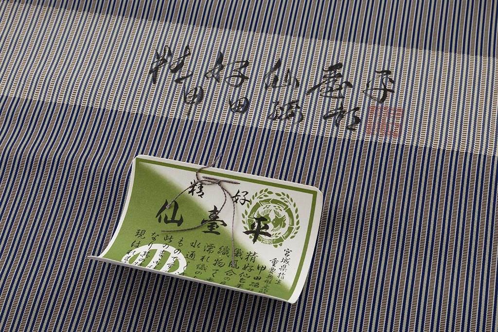 甲田綏郎さんは「精好仙台平」という重要無形文化財の技術保持者です。仙台平は宮城県仙台市の合資会社仙台平が製造する高級絹織物で、草木染めで糸を染色し、光沢のある練り糸を経糸に使用し、撚りのない生糸を緯糸に使って力強く打ち込むことで、しなやかさと堅さを兼ね備えた織物です。袴を着用する場面で、座った際にはしなやかで、立った際にはひだの織り目が自然に落ち着いて、堂々とした美しい姿勢を保ちます。甲田綏郎さんは平成14年に重要無形文化財技術保持者に認定され、お父様の栄佑さんも同様に重要無形文化財技術保持者であられました。