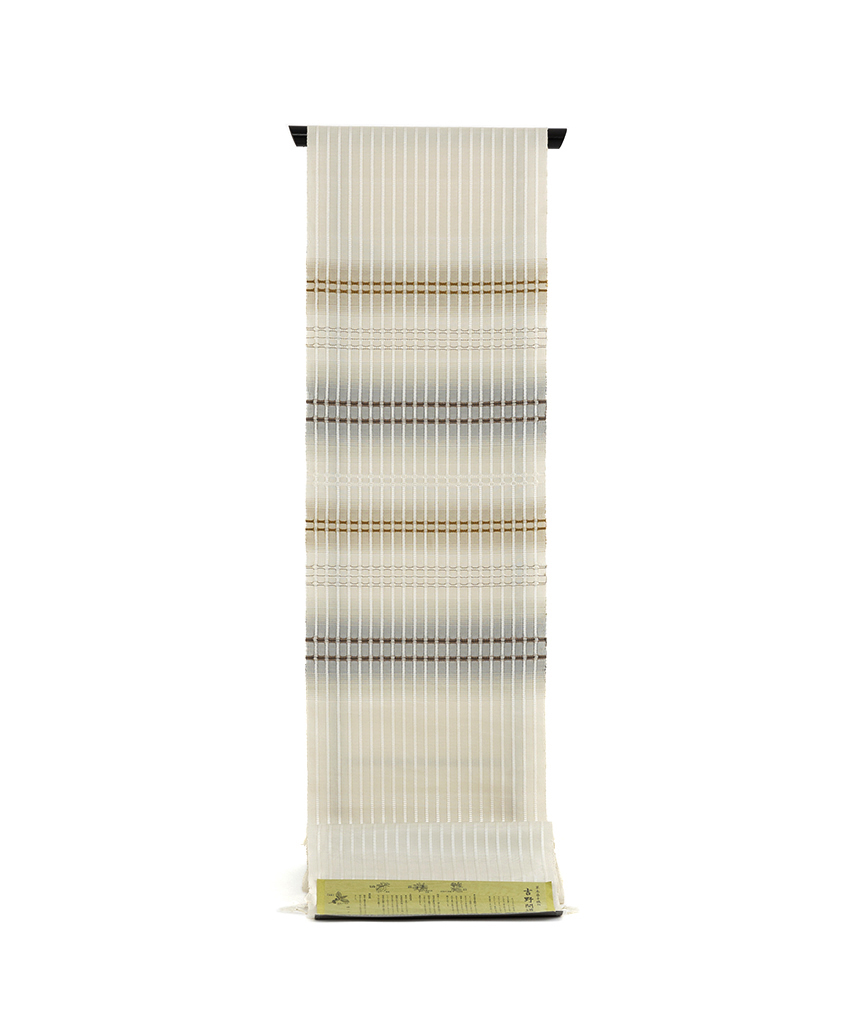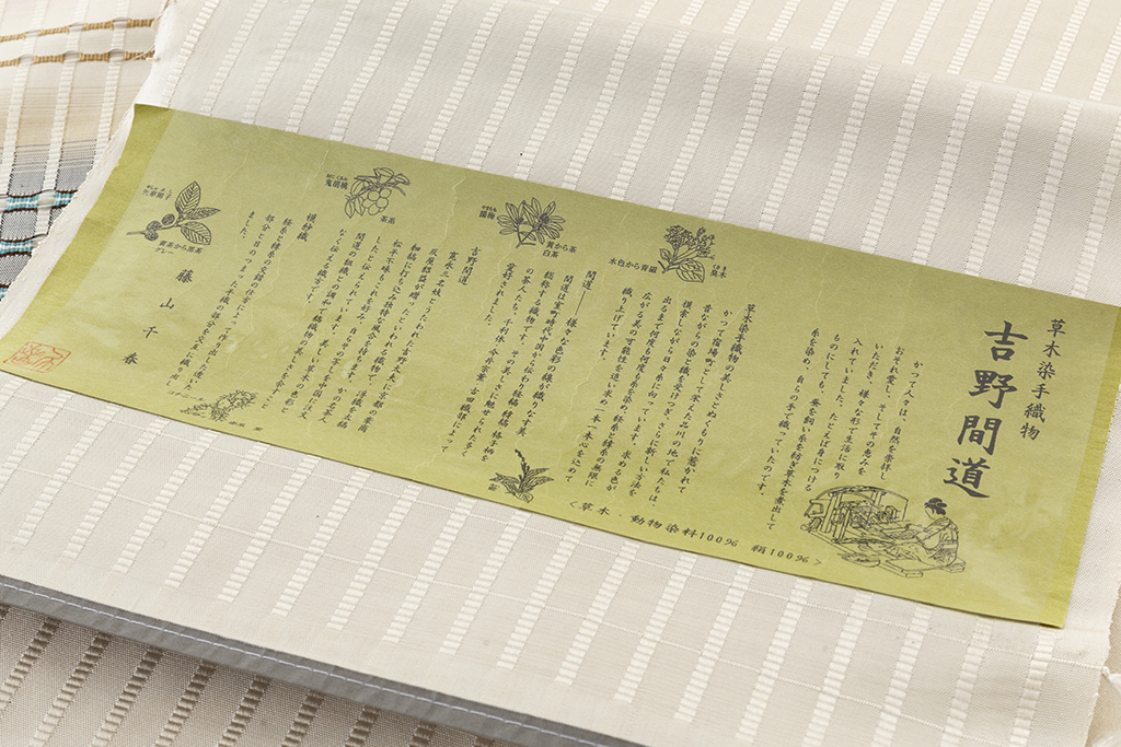 藤山千春さんは、江戸時代に生まれた「吉野間道」を、現代の街並みに似合うセンスで織り続けています。「吉野間道」とは、寛永の三大名妓である吉野太夫に、京の豪商である灰屋紹益が贈ったと言われる名物裂の一種であり、南蛮渡来の縞織物です。平織の上に地厚な吉野格子を浮き縞として織り出したもので、かの名茶人である松平不昧も好んだ織物です。 柳悦孝氏(柳宗悦氏の甥)らが吉野間道を復元し、藤山千春さんは悦孝氏の一番弟子として師事し、吉野間道を作り続けています。この織物は指で触れると独特の存在感があり、やわらかな浮織の畝が光を受けて浮かんだり、おさまったりします。その表情の豊かさは工芸的な美しさを楽しむことができます。