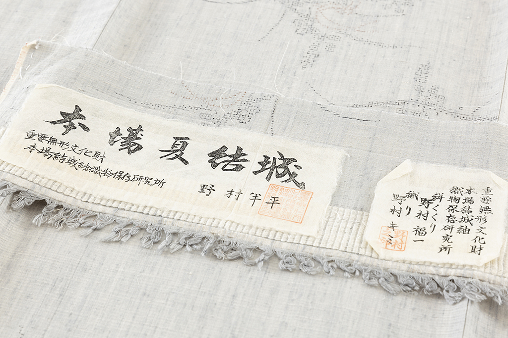 野村半平氏は明治37年に結城市で生まれました。高等小学校を卒業後、結城紬の職人の道に進みました。戦中の奢侈禁止令が出された際も、結城紬を守り続け、国の重要無形文化財指定に尽力しました。彼は生涯を結城紬に捧げた稀有な方です。 指定の要望を断り続けたという逸話が伝わるほど、野村氏は非常に希少な真綿糸(160亀甲用の糸)に細い麻糸を20%含んで地機で製作して織り上げる作品を生み出してきました。その作品は羽のような軽やかさを実現し、夏の風を感じさせる特別な風合いが特徴です。一反程度の生産に数年を要し、大変手間と時間がかかる究極の織物です。独特な上質な細糸と地機によって生まれるその軽やかな着心地は、他に類を見ない風合いを持っています。