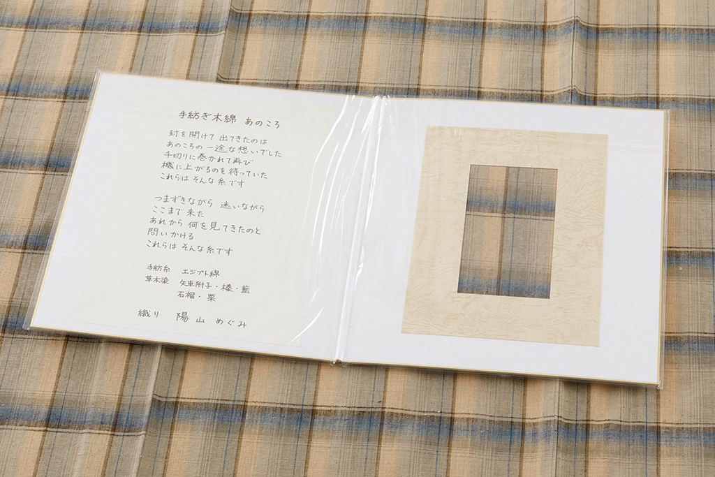 陽山めぐみ(ひやま めぐみ)は、奈良県に工房を構える染織家。綿の選定から糸紡ぎ、草木染、織りに至るまで、すべての工程を自身の手で行う「手紡木綿」の制作で知られている。 1964年大阪生まれ。1987年より2年間、出雲織の第一人者・青戸柚美江氏に師事し、絣の技法を習得。さらに1989年からは土佐手縞の福永世紀子氏のもとで、手紡ぎ糸による組織織を学び、表現の幅を広げた。 厳選した綿を細く均一に手紡ぎした糸で織り上げられる布は、しなやかで柔らかく、肌になじむ心地よさを備えている。染色においては、自ら採取した植物を染料とし、一本の糸に一か月近くかけて十数回にも及ぶ染め重ねを施すことで、単色では表現できない奥行きのある色彩を生み出す。化学染料にはない温もりと深みを湛えた色合いは、陽山作品の大きな魅力である。 また、染め上がった糸の表情を見極めながら最適なデザインを導き出す制作スタイルも特徴のひとつ。全工程を一貫して担うからこそ可能な、素材と真摯に向き合う創作姿勢が作品に息づいている。 国展や日本民藝館展などで受賞を重ね、国画会準会員として現在も精力的に制作を続けている。 1964年 大阪市に生まれる 1987年 出雲織の青戸柚美江さんに師事する 1989年 土佐手縞の福永世紀子さんに師事する 1992年 第66回国画会新人賞 第17回全日本新人染織展京都市長賞 1994年 第19回全日本新人染織展大賞 日本民藝館展奨励賞 2014年 日本民藝館展奨励賞 2018年 第92回国画会国画賞 国画会 準会員