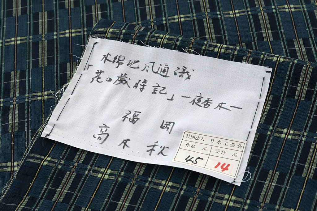 高木秋子(たかき あきこ)は、1917年、父の赴任先であった北京に生まれ、12歳の時に家族とともに福岡へ移り住んだ。福岡高等女学校に進学し、在学中に中村研一氏や山喜多二郎太氏から美術の基礎と洋画を学び、表現への素地を培った。 戦後は森山虎雄氏に織の基本を師事し、その後、紬や浮織、しじら織など多様な染織技法の研究に没頭。長年の探究の末、60歳を過ぎて出会った極めて細くしなやかなスーピマ綿の特性を生かした風通織に到達し、以後その技法は制作の中心となった。 「木綿という素材の価値を高めたい」という強い思いのもと、綿だからこそ表現できる気品と温もりを追い求めた作品は、高い芸術性をもって評価され、日本工芸会会長賞を二度受賞。県展や西部工芸展においても最高賞を受けるなど、染織文化の発展に大きな足跡を残した。 綿を極めたその織物は、やさしさに満ち、肌なじみの良さと深い品格を併せ持ち、今なお多くの着物愛好家を魅了し続けている。